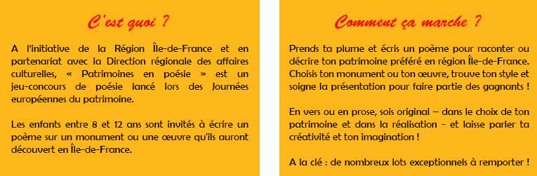 Jeu-concours "Patrimoines en poésie" du 16 septembre au 16 octobre 2017 co-organisé avec la Drac Île-de-France en partenariat avec Epopia, la RATP, Le Petit Léonard et Môm'Art.
